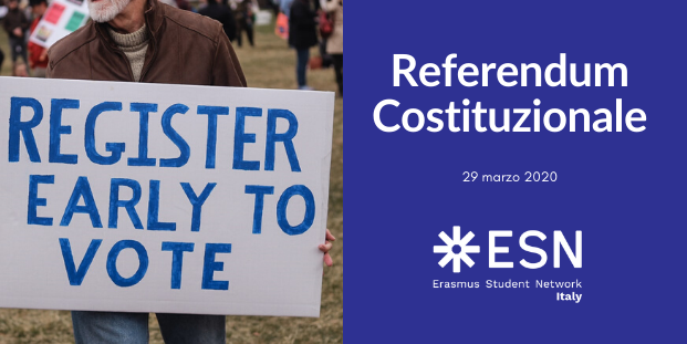 Erasmus Student Network Italia, che ha tra i suoi scopi principali quello della promozione della cittadinanza attiva, ricorda a tutti i cittadini italiani temporaneamente residenti all’estero che anche loro potranno esercitare il diritto di voto nel Referendum Costituzionale del 29 marzo 2020, in vista del Referendum costituzionale, anche loro potranno esercitare il diritto di voto.